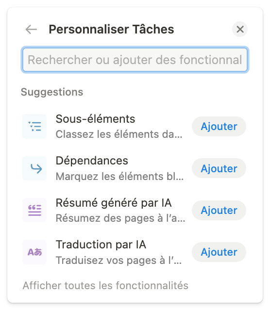 La fonction peut vous être suggérée, dans le cas contraire, tapez “Sous-éléments” dans la barre de recherche et cliquez sur “Ajouter” puis “Activer les sous-éléments”.