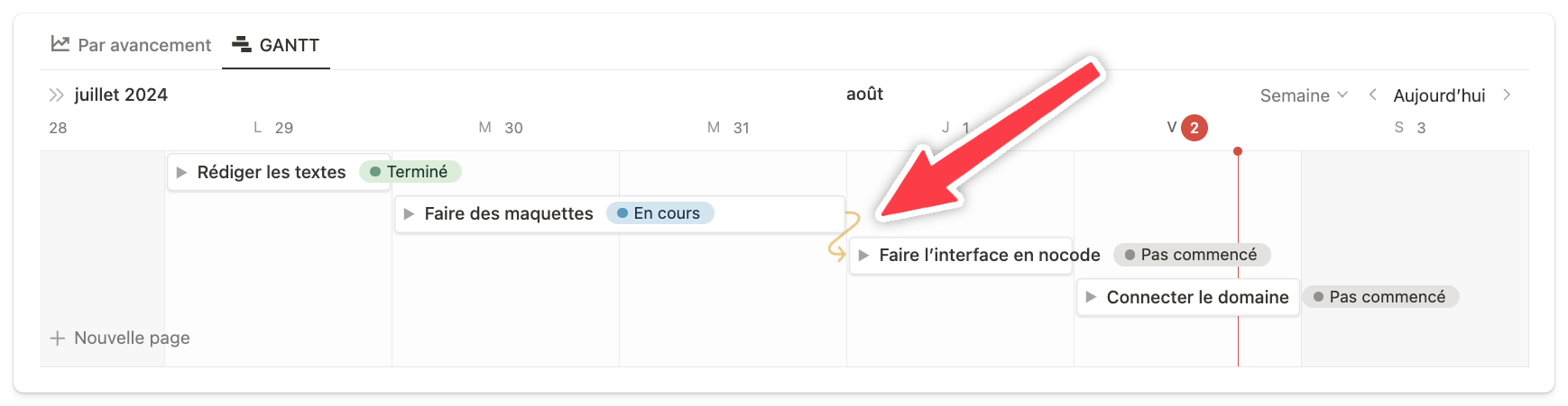 Cette option fonctionne également sous forme de relation. Tant que la première étape n’est pas terminée, on indique qu'on ne peut pas passer à la suivante.